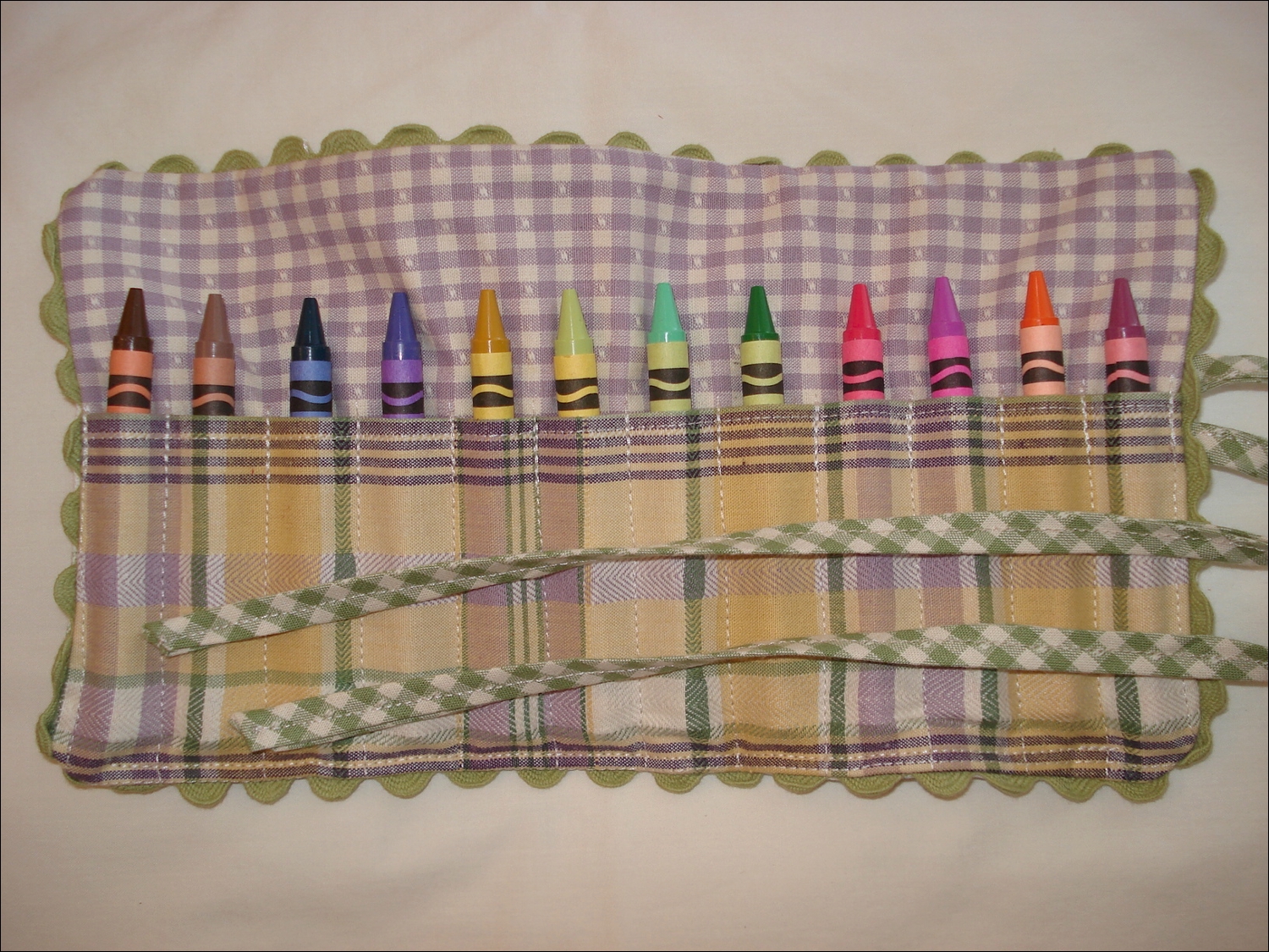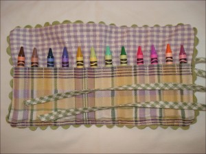 Crayon Pouch Rolled UpOf course this project had the same small-town-inflicted lack of materials as all of my other projects, but I made up for it with a side-trip to Tuesday Morning on our way to Duncan for a bed and breakfast getaway this week.  While there to get bed sheets, I found some cheap scrapbooking trims and ribbons that had a yard of the PERFECT green color of ric-rac to match the French toille leftover from Hunter’s baby bedding.  That’s the fabric I made her pouch from, and Will’s I made from scraps left over from his toddler diaper bag I made several years ago.  I knew I was saving these scraps for something good!  And I have a ton more left.