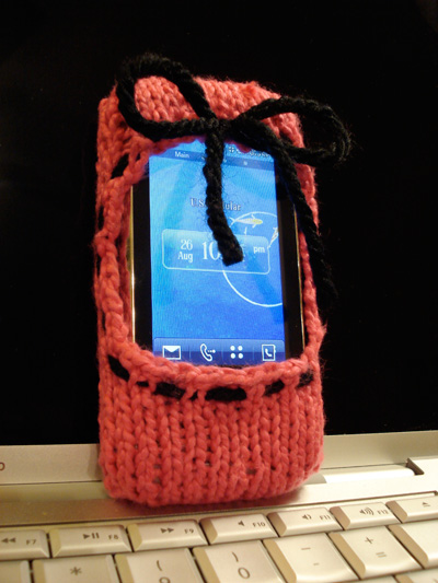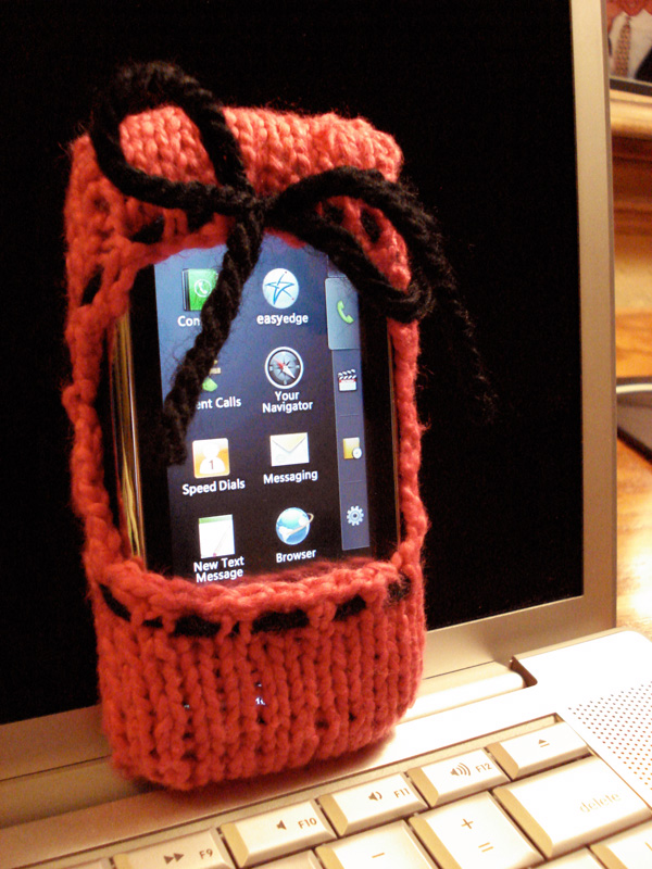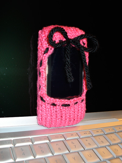 Howevah…this just-a-phone has the cutest dang cover anywhere!! I searched the internet far and wide for knitting patterns for iPhone cozies, and I couldn’t find what I wanted. So I made up my own. I made two, actually, and hated the first one, which was a sock. It was cool, and I learned a new knitting skill–magic cast on–, but I couldn’t use the phone in the sock, nor get it out in a hurry. The new and improved version is a SLIPPER instead–a hot pink slipper with a cute little black bow at the top. Now that’s one sexy aPhone. It sort of takes the sting out.